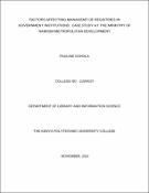 Item INFORMATION ETHICS AS A GLOBAL ISSUE/ NORTH/SOUTH IMPLICATIONS(Globe ethics, 2014-07-29) Kibugi SarahAbstract This paper looks at information Ethics in the North and South. The North for the purpose of this paper represents the developed countries while the South represents developing countries and more so Africa. The author presents in general various views of Information Ethics (IE). She also looks at the development of Information ethics. The author highlights the activities of Information Ethics in Africa Finally issues hindering progress of IE in Africa are highlighted.Item MANAGING ESTATES RECORDS: At:ASE STUDY OF THE ESTATES DEPARTMENT OF MOl UNIVERSITY, MAIN CAMPUS BY(2019-04-01) AMBUA, GIDEON KYEMBA WThis study set out to investigate the management of Estates records at the Estates Department of Moi University, Main Campus. In fulfilling this aim the study had a number of specific objectives. These included; to document the business activities of the Estates Department; ascertain how records are created or received, maintained and used by the Estates Department of Moi University, Main Campus; determine the extent to which the records support the business activities of the Estates Department. Establish the conditions under which Estates records are maintained; determine policies used to regulate the management of Estates records; find out the calibre of staff employed to manage the Department's records including their level of training, experience and qualifications. In conducting the study a purposive sample of 26 respondents, comprising staff of Estates Department Moi University, Main Campus were identified to participate in the study. Various methods including the use of questionnaires and interviews were employed in data collection. Descriptive techniques were used to analyze qualitative data collected from respondents. Tables and charts were employed to give more detailed presentation and analysis. Among the findings of the study were that the Estates records were generally poorly maintained; some records were not arranged in an orderly manner; the records were poorly classified and some records were missing or misplaced. Other findings were that the Estates Department generates or receives various types of records ranging from operational, legal, evidential, human resource and financial. These records paused a major challenge especially in their storage and maintenance. The other finding was that the Department had no standard retention/disposal schedule; security of the records was wanting; there were no records management policies and procedures; and that the staff managing the records unprofessional. Based on the above findings this study concluded that the Estates records were poorly managed and came up with recommendations for records management practices and operations.Item [YALUATION OF THE LEVEL OF USER EDUCATION SERVICES PRO\lDED BY PUBLIC LIBRARIES: A CASE STUDY OF KENYA ~-ATIO:\AL LIBRARY SERVICES, ELDORET BRANCH.(2019-04-01) JEPKOECH, RUGUT VIOLAABSTRACT This study auempts to examine the importance of user education in public libraries. The research was carried out in KNLS Eldoret branch with the aim of investigating the extent to which it offers user education services to its users, and to determine whether user education service has an impact on the access of information materials by users. The purpose for using this case study is to enable the researcher use the findings to represent other Kenyan public libraries in general. User education services are important to the public libraries in that it assists the users to be able to access information materials. The users will also be able to access the information materials on their own and within the shortest time possible. A survey research method was employed in carrying out this study. The population of study comprised of children and the adults. The researcher used random sampling method and a sample chosen consisted of 10 members of staff and 30 users. The study re\ ealed that user education was not offered by KNLS Eldoret therefore making the users to be unable to frnd information materials. Users were also not satisfied with the user education training which was offered five years ago, it does not have user education services policy to guide the staff on how user education should be offered should be addressed and that few staff were trained on how to provide user education services. The study concludes that the best user education service should be provided in public libraries. The recommendations made include formulation and implementation of user education policy and the train· of staff.Item IMPACT OF ACCESS TO ELECTRONIC' INFORMATION RESOURCES ON STUDENTS AND LIBRARY STAFF. A CASE STUDY OF MARGARET THATCHER LIBRARY(2019-04-01) NG'ETICH, ALLAN C.ABSTRACT Electronic information resources has played a greater role in the students' academic work. There is an increasing trend in use of electronic resources in many university libraries. This is due to the fact that electronic resources are more current and more its accessibility is higher as compared to is counterpart print journals. Chapter one would discuss mainly aims of study, statement of the problem and objectives of study. Chapter two contains a theoretical framework, relevant and related literature citation to the research topic. One ofthe topics discussed in this chapter is current state of electronic information resources inuniversity libraries in Kenya. Chapter three discusses all the research methods, techniques and tools used in the accomplishment of the project. This includes:Research settings, research design, population, sample, sample techniques, data collection, and instrwnentation i.e. questionnaires and face to face interview, data analysis by use of descriptive statistics, tables and percentages. Chapter four contains the main research findings and analysis of the research project. Among the findings it was established that there 